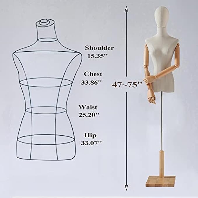 【Adjustable Height】This mannequin has an adjustable knob and the height of the dress mannequin can be adjusted from approximately 47 inches to 75 inches. Turn the knob to find the dress height that suits you. The movable solid wood arms can adjust the shape according to different clothing styles. Dimensions of each part of the model: Shoulder: 15", Bust: 33", Waist: 26", Hips: 35".