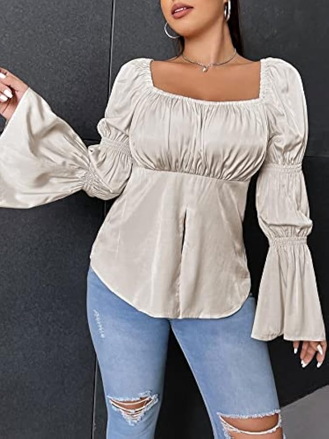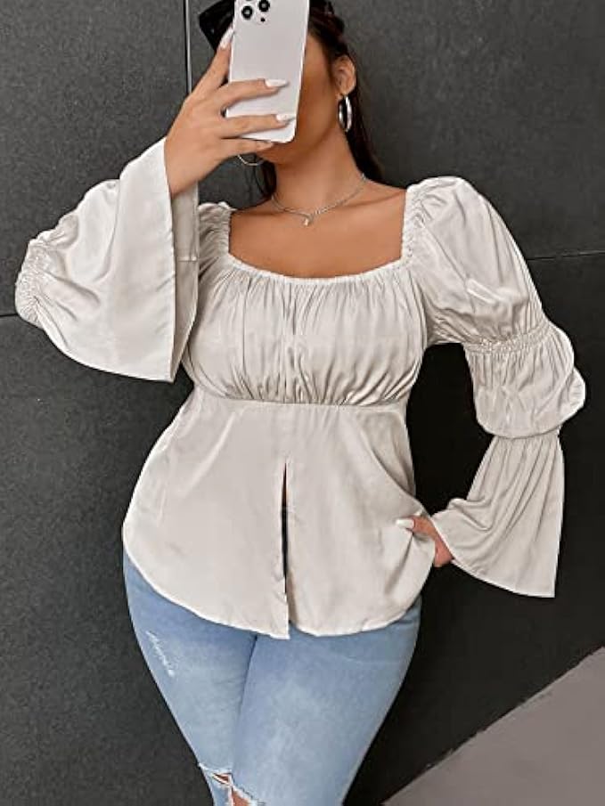 Floerns Women's Plus Size Ruched Split Hem Square Neck Flounce Sleeve Blouse Top