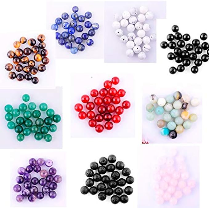 Stone beads are available in a variety of colors. Stone diameter: 8mm; Hole diameter: 1mm. Total of 240 gem beads, 24 of each color. Gemstone Names: Amethyst, Obsidian Eye Stone, Tiger Eye, Pink Rose Quartz, Geranium, Green Aventurine, Red Agate, White White White, Amazonite.