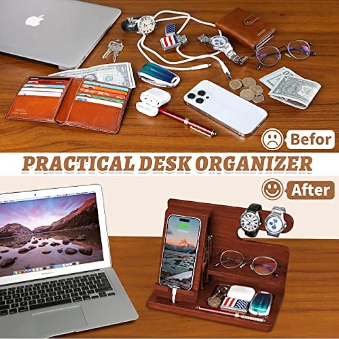 Gifts for Men Wood Phone Docking Station Gifts for him Husband Nightstand Organizer Cell Phone Stand Watch Holder Wallet Station Desk Organizers Gifts for Dad Birthday Gifts for Men