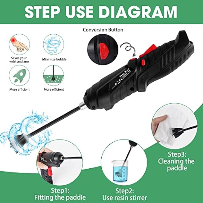 [Quick and Easy Mixing of Epoxy] - This epoxy mixer spins at an ideal speed to minimize air bubbles and deliver a clear and smooth consistency. It also has a conversion button that helps to change the shape (straight handle and hand grip), so you can use this epoxy mixer alternately according to your needs. Works great with epoxies, acrylic paints, latex, and other viscous liquids! Works great with epoxy molds, Jesmonite kits, resin silicone molds, and more.