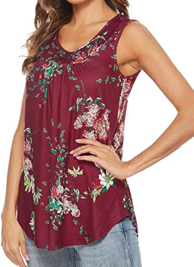 Features - Paisley Floal Prints/Pleated /Scoop Neck/Curved Hem/Button Down/Loose Fitting/Stretch Sleeveless Tunic Tank Top.