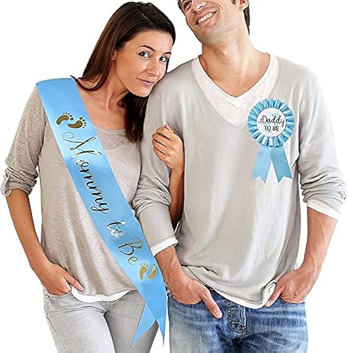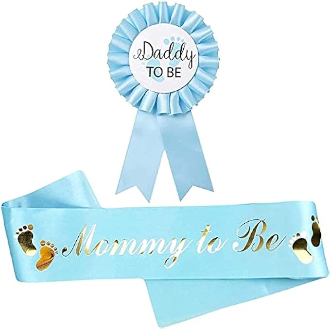 HAPPYLAND Baby Boy Shower Decorations Blue Sash and Tinplate Badge Mommy to Be and Daddy to Be Baby Shower