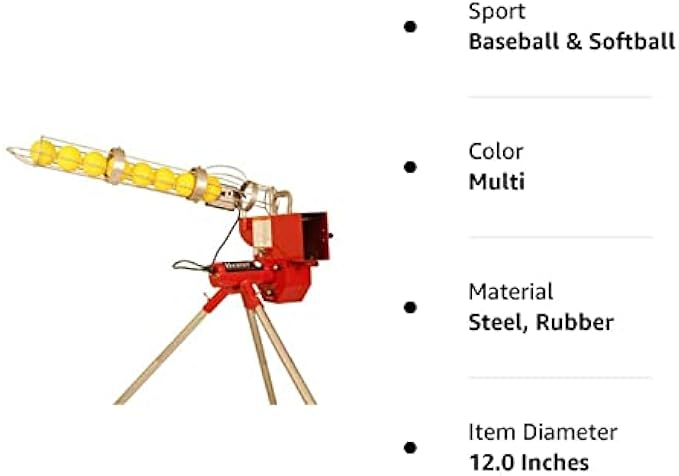 Throws Pop-ups, Line Drives, and Grounders; Uses Standard A/C Power; 12.00" Pitching Machine Softballs; Tubular Steel Legs with Rubber Tips; Recommended Ages 8 years to Adult; Adjustable Speed Control adjusts for a variety of pitch speeds; Adjustable Pitch Height; Fully Enclosed Wheel; Auto-Ball Feeder pitches every 9 seconds; Fully Enclosed Wheel provides maximum safety