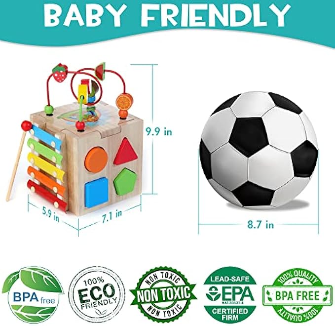 ?【8 Toys in 1】Combines 8 different activities in 1: bead maze, baby xylophone, learning clock, shape sorter, abacus, spinning gears, sorting & stacking blocks, word cards. The play cubes are great Montessori toys to keep your toddler engaged for hours and develop kid's mind, senses and coordination.