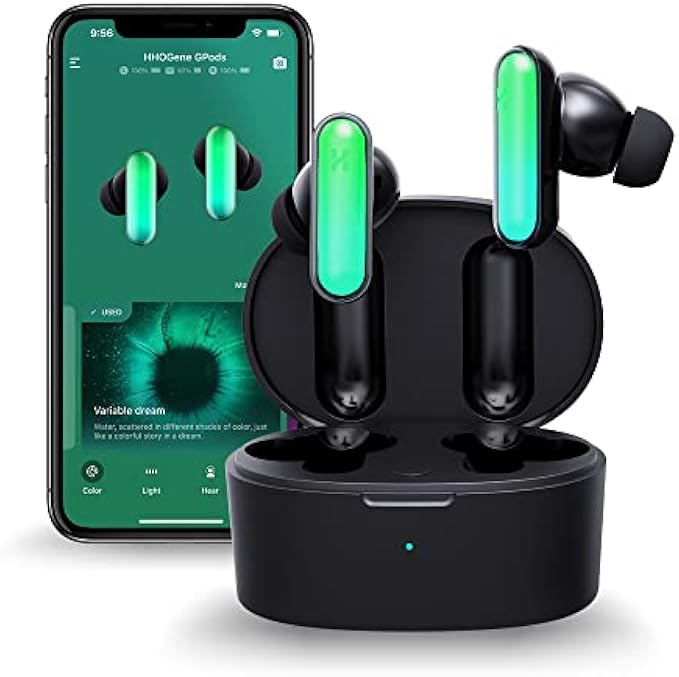 HHOGene GPods Premium Set,Wireless Earbuds with Light Control and 4 Earbuds Shells,Noise Cancelling Bluetooth Earphones with Immersive Sound,Fast Charging Case,Touch Control,Built-in Microphone,Black