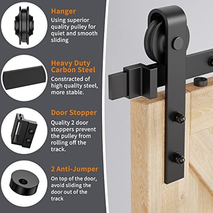 HomLxclx 5 Foot Heavy Duty Sturdy Sliding Barn Door Hardware Kit Single Door - Smoothly and Quietly - Simple and Easy to Install - Fit 1 3/8-1 3/4 inch Thickness Door Panel(Black)(J Shape Hangers)