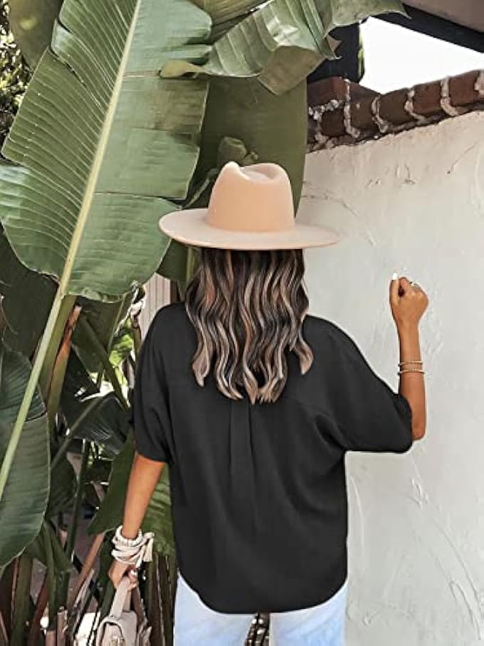 Fashion Feature: Sexy V neck, short sleeve, button down/up, loose fit, solid basic color make it looks simple but classic and fashion summer blouses for women.