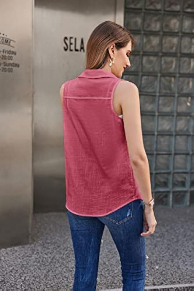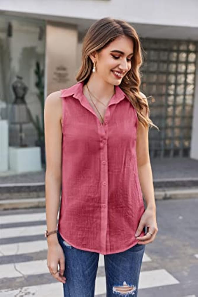 Match Various Styles. The sleeveless top is emphasized simple and casual style, whether casually styled with jeans, shorts, hip-hugging skirt, wide-leg pants, suit pants and high heels. Sleeveless button shirt is a must-have for any ladies