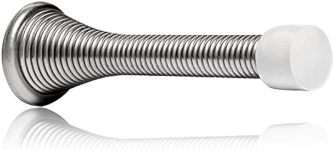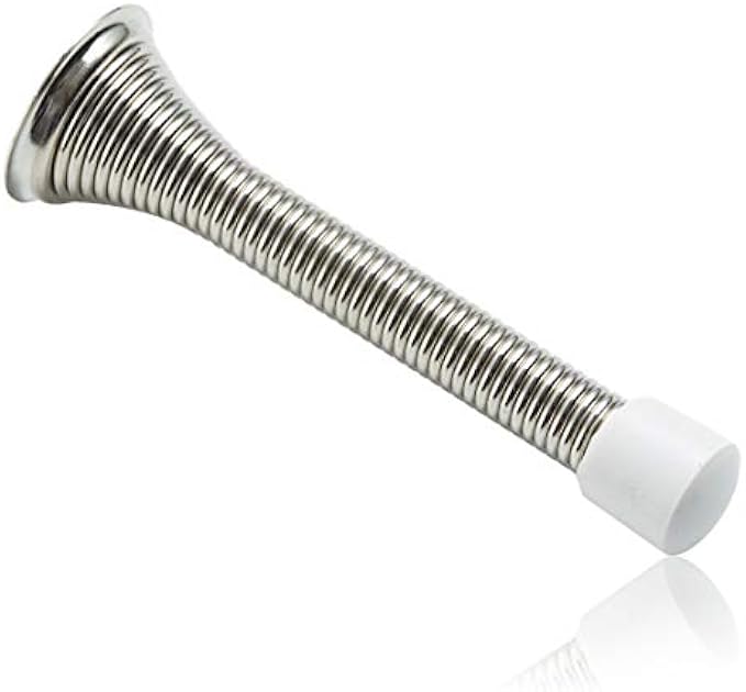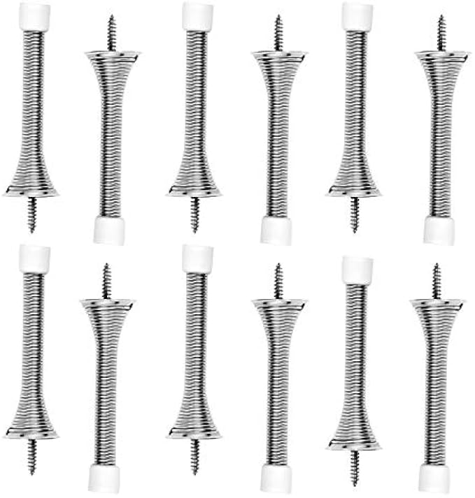 HouseHold Impressions 12 Pack Satin Nickel Door Stoppers - 3 ⅛" Flexible Heavy Duty RustProof Steel Screw-in Spring Doorstops with BabyProof White Rubber Bumper Tips - Protects Your Walls from Damage