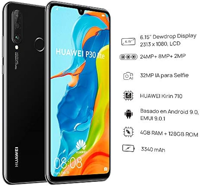 Huawei P30 Lite (128GB, 4GB RAM) 6.15" Display, AI Triple Camera, 32MP Selfie, Dual SIM Global 4G LTE GSM Factory Unlocked MAR-LX3A - International Version (Midnight Black)