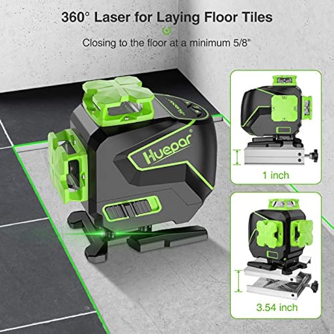 ?4 X 360° WITH TOP & FLOOR LINE LASER: This laser tool provides four 360 planes of laser light. The top 360° horizontal line can be used for ceiling installation. The 360° floor horizontal line is for tiling installation. With the lifting base, the 360° floor laser can raise from the surface to project over and travel past uneven surfaces or obstructions between 1" and 3.54" height. Two 360° vertical lines cross at 90°angles makes user quickly visualize and finish square layout.