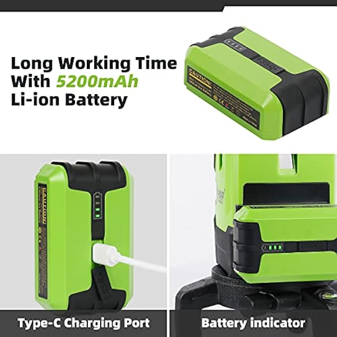 LI-ION BATTERY & TYPE C CHARGING PORT:Huepar Level laser tool adopted 3.7V / 2500mAh Li-ion battery for extended run-time about 4hours. 4 battery indicators on the Li-ion battery allow users to know the current battery level and charging status. There is a Type-C charging port on the Li-ion battery pack that can be charged separately. And the laser tool can also be charged by laptop, power bank, car charger, etc.