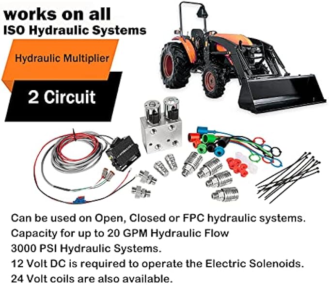 This solenoid operated valve multiplies your existing Hydraulic Outlets and allows you to control 2 circuits from the lever in your cab. It works on all ISO Hydraulic Systems and is easily transferable to multiple units.Save money versus expensive factory add-ons!