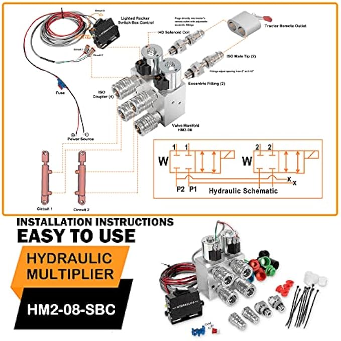 Hydraulic Multiplier 2 Circuit Kit,SCV Splitter/Diverter Manifold Valve Kit with Couplers and Switch Box Control, Turn 1 Circuit into 2 Circuits, for John Deere, for Case,for Kubota,for Ford