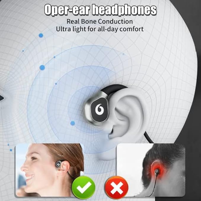 Open-ear Design: These bone-conduction headphones deliver sound through the cheekbone allowing the listeners to be aware of the surroundings while enjoying music. Buds-free and reduce the burden on the ear.