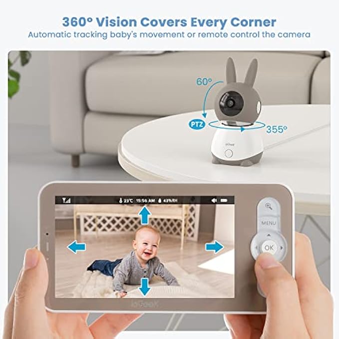 【5-inch Screen & 360° Viewing Angle】5 inches 720P LCD screen allows you to see your baby more clearly. The device supports the PTZ pan/tilt function. It can rotate 355° horizontally and 60° vertically. You can manually control the vision of the baby camera, or turn on the human detection function, then the vision of the camera will automatically follow your baby.