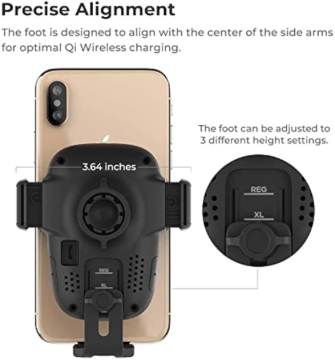 ADJUSTABLE BOTTOM FOOT: The foot of the mount can be raised and lowered to accommodate phones of various sizes. This helps to align the Qi coils for an efficient charging experience.