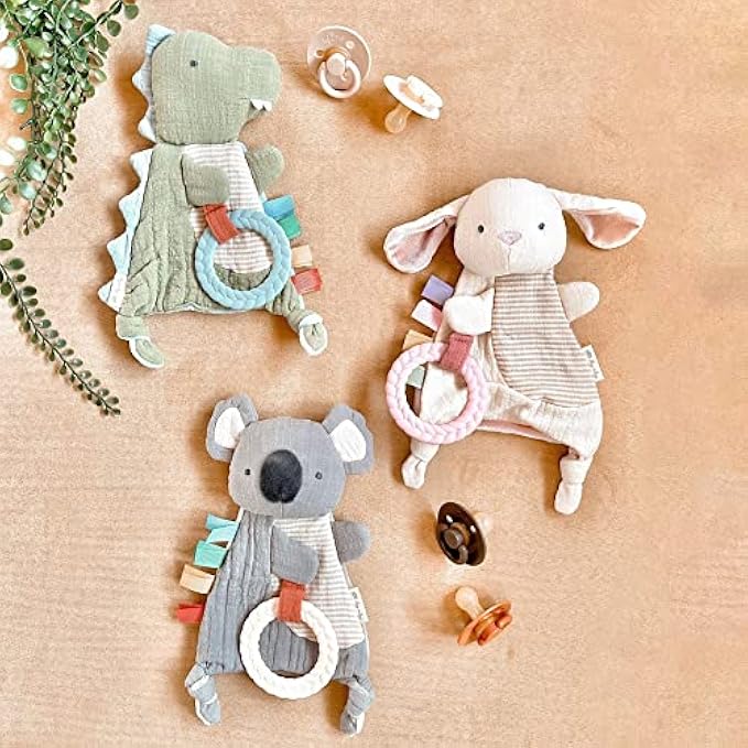 • The Bitzy Crinkle is a loveable sensory toy that excites baby with a crinkle sound, textured ribbons and a braided teething ring