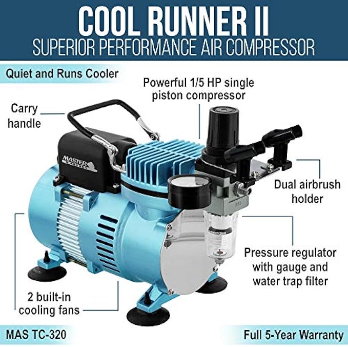 Master Airbrush Model TC-320 Cool Runner II superior performance powerful 1/5 hp single-piston compressor with two cooling fans that allow it to run much cooler for a longer continuous running time without overheating. Includes air pressure regulator with gauge and a water trap filter, 6 foot braided air hose and dual airbrush holder.