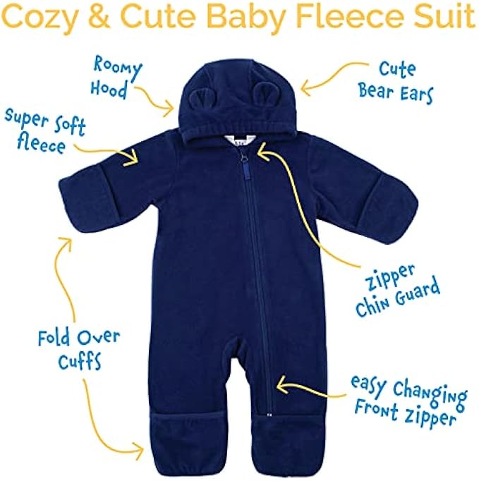 【WARM & COZY DESIGN】 Featuring a convenient front zipper for easy changing and fold-over cuffs to keep hands and feet toasty, this one-piece fleece bunting for babies is comfortable and warm. The attached hood with bear ears looks adorable and seals in extra warmth.