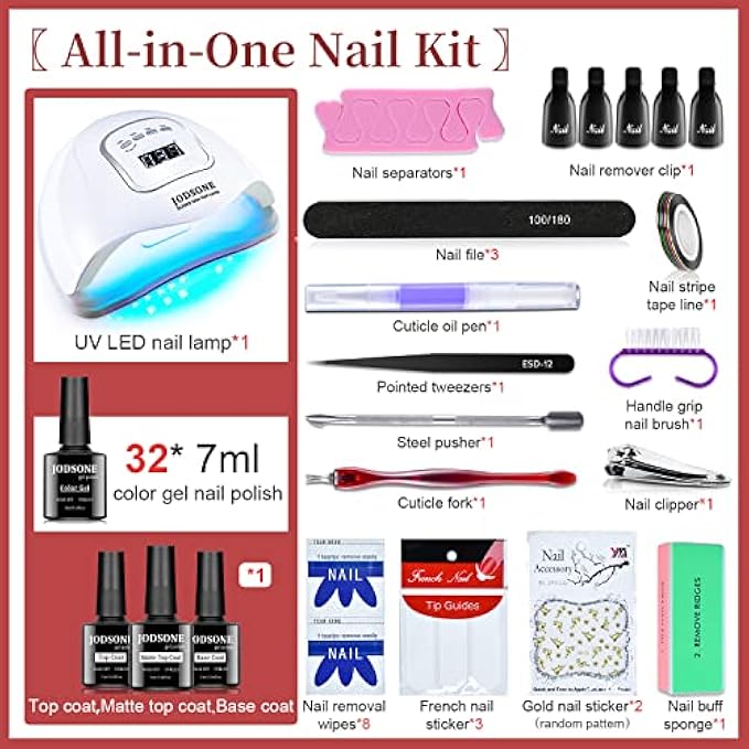 35 PCS Gel Nail Polish Set: This is a gel nail kit with super multi-color gel nail polish.It includes 32 bottles of classic gel nail polish (7ml each), 1 bottle of base coat, 1 bottle of no wipe top coat, matte top coat, a high-power professional nail lamp, and some nail manicure tools.the nail set has all the colors you need, You don’t need to go to a nail salon anymore, you can create all kinds of beautiful nail styles at home. 150W Super Fast Nail Lamp: It has 45 dual-light source lamp beads, which not only cures quickly but also cures nails without dead spots; it has a LCD display and 4 timer buttons, which make it more convenient for you to use; smart sensors, just put your hand in and the light will turn on automatic light, release, the light will automatically go out. Suitable for professional salons and personal families. 32 Colors Gel Nail Polish: It is composed of 9 healthy ingredients. It is healthy, low odor, high gloss. It includes black, white, nude, purple, blue, green, red, pink, yellow and other classic colors. The gel polish needs to be cured under LED lights. If you use it properly, it can last for more than 3 weeks. Beautiful Gifts: If you are looking for birthday, anniversary, Valentine's Day, Mother's Day, Halloween or Christmas gifts for your family or friends, the gel nail kit will be a good choice. Warm Notice : Nail gel polish has different color differences in different light sources, displays and coatings. The color card shown in the picture is coated with two layers of color gel. When you encounter any problems, please feel free to contact JODSONE.