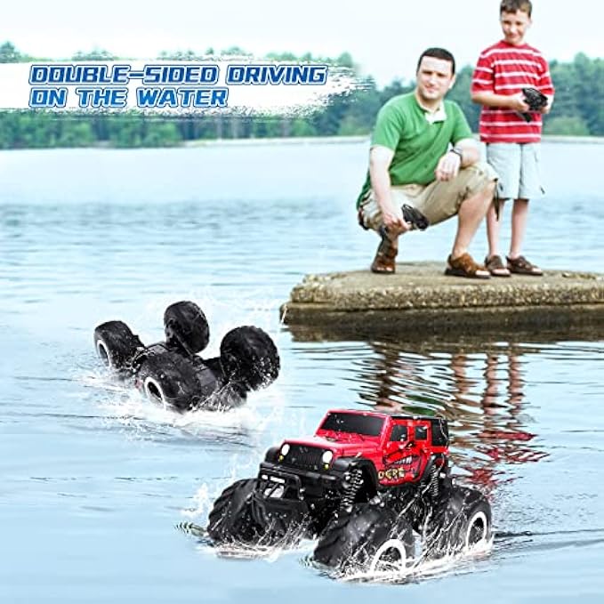 JONEALA RC Trucks 4x4 Offroad Waterproof. I thought this would be fun for the grandkids to play with when visiting. It comes fully assembled and ready to go right out of the box. It is a nice size, made of plastic, and has rubber wheels. It comes with 2 battery packs and a cable to charge the batteries. The cable has a USB-A plug, but you will need a power adapter to charge. The remote requires 2 AA batteries, not included. The charging cable plug does light up green when charging is completed. The battery cover uses a screw to hold it down and they do include a screwdriver for this purpose. I found the battery compartment to be a little tight so you just have to make sure that you stuff the connector in the side while also sliding in the battery. The battery must be removed to charge. The rubber vacuum wheels are large and provide cushion if you accidentally run into something. The truck is fast but only provides for one speed as there is no gradual variable speed option. You’re either stopped or going full speed. The steering is controlled by the motors not by turning the front wheels. This method is effective, just takes a little practice to get it right. It is all wheel drive which is great as I had no problem running this on carpet or thick grass. The control range is good and it does run for 15 minutes or more without issue. The description states it runs in water, but I have not tried this. Overall, a fun toy!