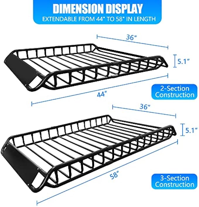 EXTRA LARGE SIZE & CAPACITY: The roof rack carrier is extendable from 44" to 58" in length.Overall Dimension : 58"(L) x 36"(W) x 5.1"(H); the size without extension: 44"(L) x 36"(W) x 5.1"(H).The roof rack basket can safely and reliably load up to 200Lbs of cargo.