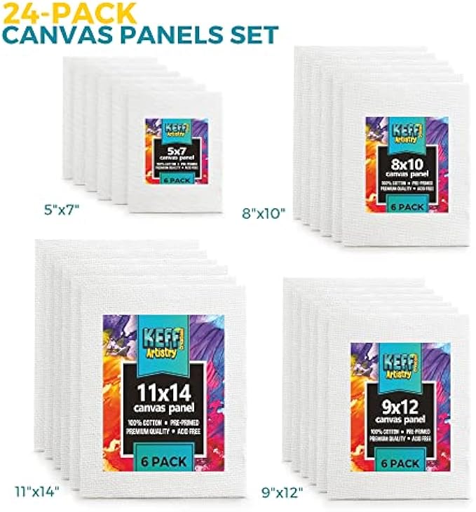 KEFF Oil Painting Canvas - 24 Pack Art Painting Canvas Panel Set - 12.7 x 17.2 x 25.4 cm, 27.9 x 35.5 cm, 100% Cotton Primed Painting Supplies for Acrylic, Oil, Pastel and Watercolor