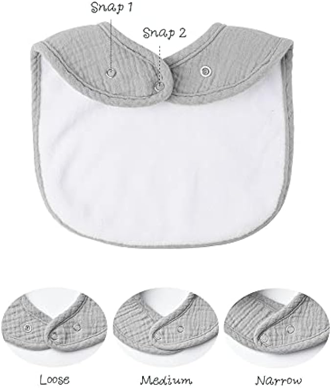 • SOFT and ABSORBENT: The front of baby bibs are made of 100% cotton(Muslin) and the back are polyester(comfort fleece) for maximum absorption with skin-friendly soft touch. The bib soaks up all drools and spits to keep you and your baby clean and dry, no more wet clothes!