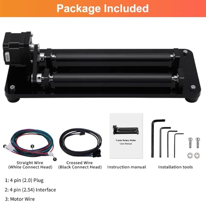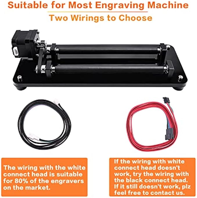 【Wide Compatibility】Rotary roller module rotary laser engraving machine fits most laser engraving machines and 3D printers. Compatible with most laser engravers. Wide compatibility, we have prepared two wires with different wire sequence for you: white connector (straight line: 12V PWM GND) black connector (cross wire: 12V GND PWM)