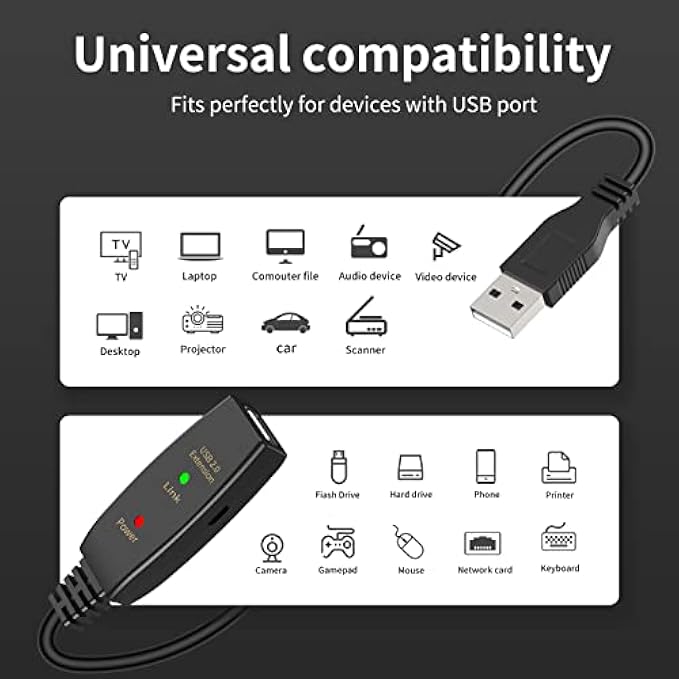 【FLEXIBLE&DURABLE】: With metal wire braid inside, the cable is flexible and resistant to pull and drag. The gold-plated connectors can bear more than 10000 times plug. The ABS and PVC case is anti-abrasive. UNIVERSAL COMPATIBILITY: The USB active extender is broadly compatible with Windows, Mac, Linux, Chromebook, and USB 2.0 peripherals including hard drives, USB hubs, mice, keyboards, flash drives, printers, and more.