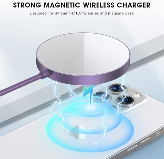 Wireless Magnetic Phone Charger Specifically for iPhone 14/13/12 Series: With New magnetic technology makes wireless charging a snap. Perfectly wireless charging pad compatible with mag.safe charging for iPhone 14, iPhone 14 Pro, iPhone 14 Plus, iPhone 14 Pro Max,iPhone 13,13 Pro,13 Pro Max,13 mini; iPhone 12, iPhone 12 Pro, iPhone 12 mini iPhone 12 Pro Max.Up to 7.5W secure wireless charging. And with models of AirPods Pro /3 & 2 with a wireless charging case. Optimal Charging with 20W Adapter: A 20W PD USB C charger block will come with this magnetic wireless charger to improve charging experience. The product charging time is just 2.5-3 hours. iPhone Magnetic charger works like the original and can be used with a professional Magnetic Clear case to charging other wireless devices like iphone 11/pro/max /iphone X and etc. If your phone case isn't made with Magnetic, please remove it for charging. Superior Safety: The wireless magnetic phone charger prevents the charger and your phone from overcharging, over current, over voltage, over heating, and short circuit. Provides you with a better and safer charging experience.The optimized magnetic design makes charging easier , improving energy conversion and reducing heat while charging. Entertainment Companion: Mag safe charger design wireless charging pad make hassle-free and enable you to play games, watch movies & videos, Face Time, pick up to check emails or messages from any angles. With 3.96ft long cable allows you to freely operate the device and juice up your phone simultaneously at home, in the office or car anytime. Portable & Travel Companion: Lightweight and compact design wireless charging station is quite smaller than other desk wireless chargers, it can be put in pocket ,shoulder bags, handbags, travel bags.Package includes :1 x Magnetic Wireless Charger, 1 x USB-C cable, 1 x 20W PD Fast wall charger, 1 x User Manual.
