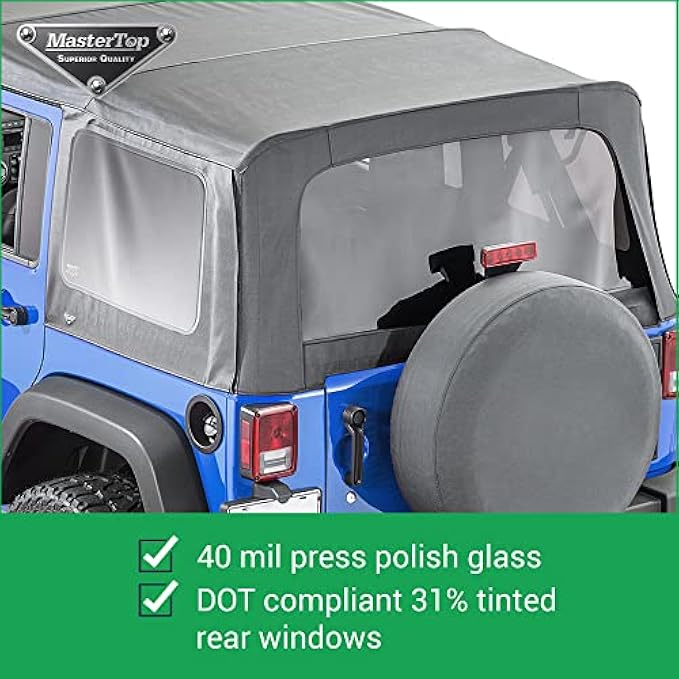 PREMIUM REMOVABLE WINDOWS - unlike "Rolled" glass that's used by low-cost competitors, MasterTop uses Press Polished glass that does not distort your view and ensures long lasting use. 40-mil, D.O.T. approved side and rear windows feature 31% tint
