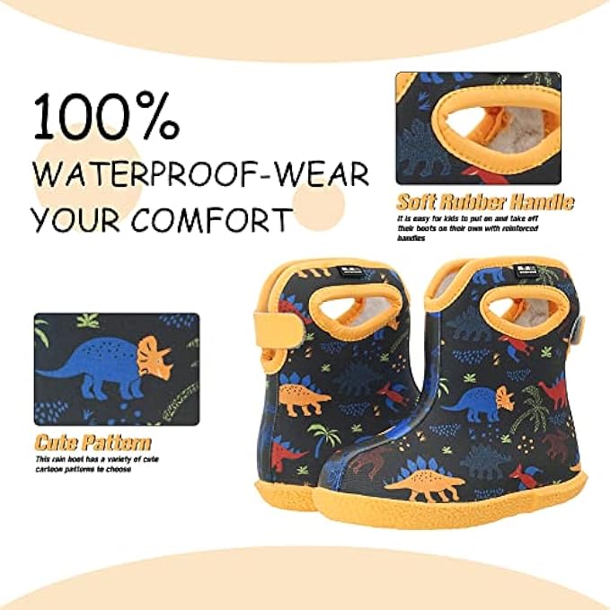 Soft plush lining to feel more comfortable: Soft plush linings provide additional comfort in cold, wet weather. It makes children feel warmer and more comfortable than other ordinary boots. It is so soft that it will not rub kid's skin. The rain boots are easy to put on and take off with sturdy handle. Children will enjoy their trip wherever they go