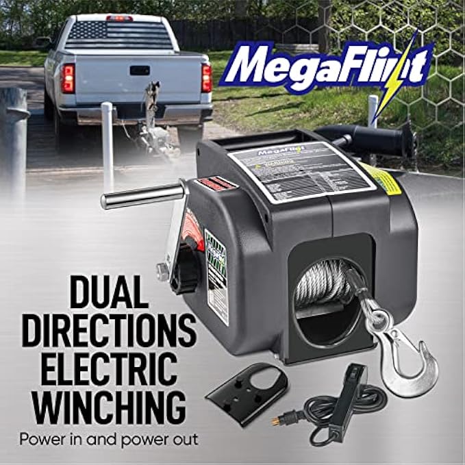 Megaflint Trailer Winch,Reversible Electric Winch, for Boats up to 6000 lbs.12V DC,Power-in, Power-Out, and Freewheel Operations,30% Higher winching Power Than Regular 6000 lbs Winch (5000lbs Marine)