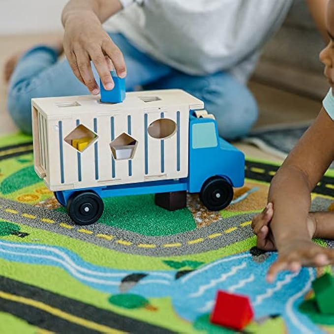 WOODEN DUMP TRUCK & SHAPE SORTER: The Melissa & Doug Shape-Sorting Wooden Dump Truck Toy is a two-in-one entertainment and pretend play experience. It includes 9 colored blocks in different shapes and 2 play figures.