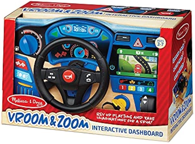 Realistic play steering wheel mounted on a sturdy wooden dashboard with lights, sound effects, and moving parts, including a scrolling GPS