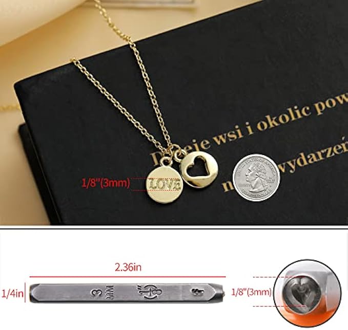 【Professional Metal Stamp Set】 - You will enjoy the most complete DIY metal stamp set in no time! It includes a metal stamping jig, a stamp hammer, a steel base and 74 pieces 1/8"/3mm punch set, including "AZ "Letter, "az" letters, "0-9" numbers, a "❤" and 2 "&" symbols punched.
