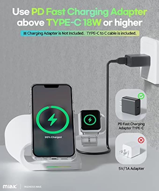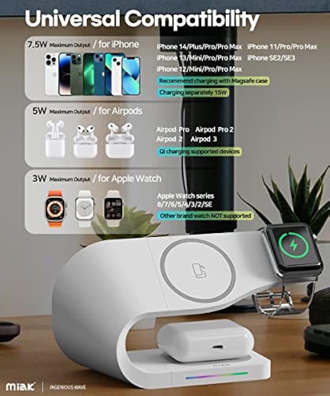 Charges my devices Perfectly. I have an iPhone 11 and an Apple Watch and both charge with ease, and pretty fast actually. However the included Power Adapter (plug) has a serious fault inside the design of it. It has a constant whine noise, that will not go away unless it gets unplugged. This would be an easy 5 stars if the power adapter worked properly.