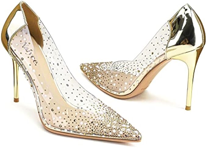 ? Crystals & Transparent: Naiyee Scarlett classic pointed toe stiletto pump is crafted from high quality transparent PVC with crystal-embellished, mix of mirror patent leather closed back. Slip on style, easy on and off.