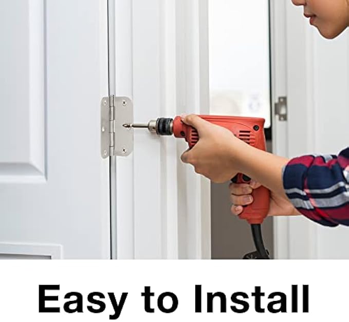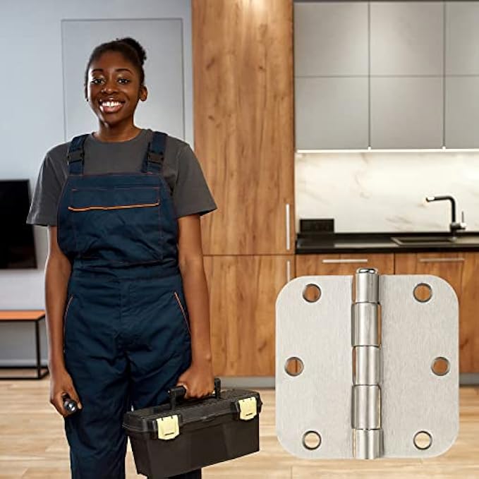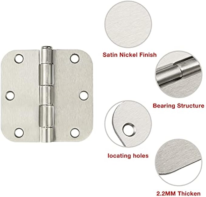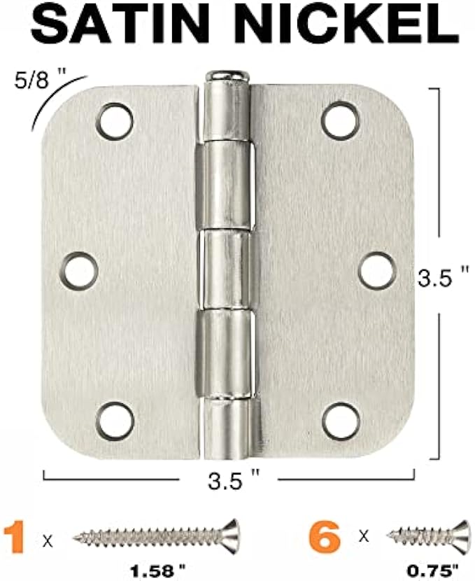 SIZE&Package:3-1/2 inch x 3-1/2 Inch; Radius Corners:5/8 Inch.The brushed nickel door hinges suitable for most door frames and window frames size for residential.Package includes 6 Pack satin nickel door hinges, 36 short screws and 6 long screws.We use a strong box to pack these hinges.