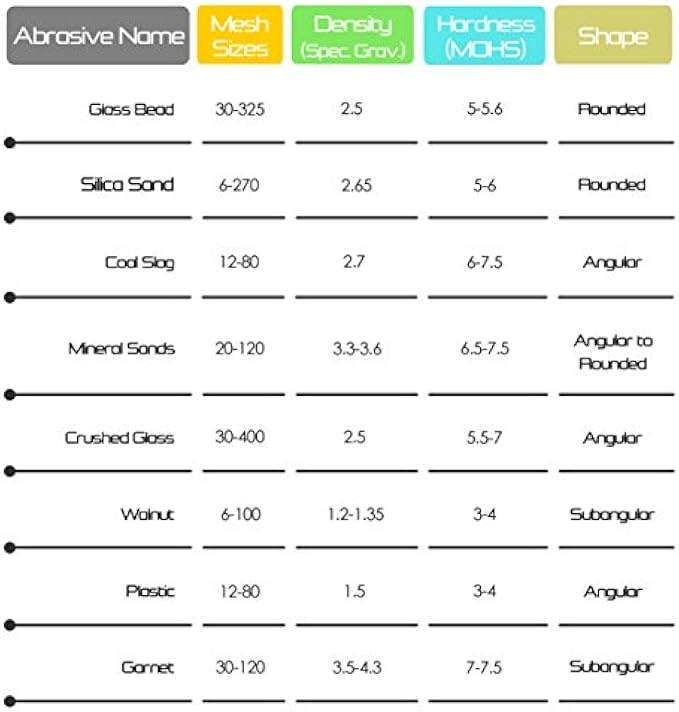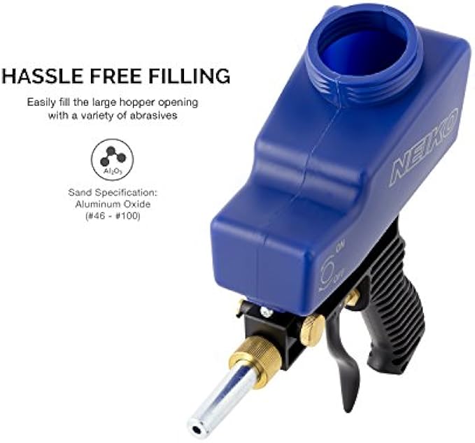 [COMPATIBILITY]: The gravity feed hopper accepts multiple types of media including silicon carbide baking soda, sand, aluminum oxide beads, glass, and walnut shells to blast away a variety of unwanted surfaces.