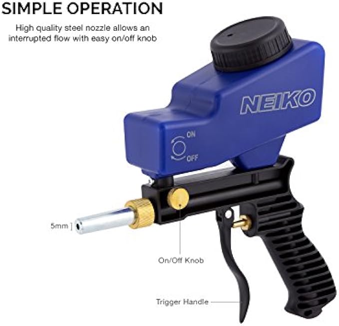 [APPLICATION]: This air sand blasting gun in handheld and useful for a variety of needs, which include etching mirror and glass, removing metal rust, paint, oil, oxidation, grime and stains such as dirt from tiles and grout to be the perfect companion for home improvement work.