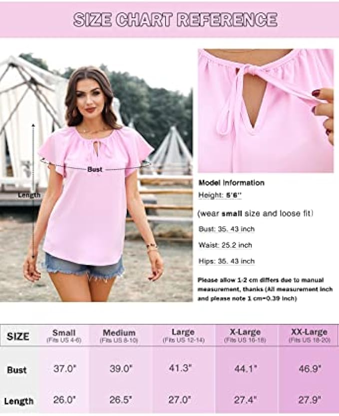 95% Polyester, 5% Spandex Imported Drawstring closure Machine Wash Women Chiffon Blouse is Lightweight, Relaxed and Comfortable to Wear. Fabric has no stretch. Features: Casual Chiffon Tops, Fashion Boho Shirts for Women, Womens Short Sleeve Tops and Blouses, Sexy V Neck Drawstring Blouses, Ruffle Sleeve, Loose Fit, Floral Printed Tops for women. Size: Small(US 4-6), Medium(US 8-10), Large(US 12-14), X-Large(US 16-18), XX-Large(US 20). You can wear it with jeans, legging, pants, shorts, skirts, good for a fashion, cute, bohemian look. Perfect for Spring and Summer. This v neck chiffon tops blouse is perfect for daily style, smart casual, business, work office, home wear, casual wear or party, night out, summer or winter holidays, going out, back to school, street, date, vacation, etc. Attention: 1. The light color may be a little see through. 2. Hand wash or machine wash. Do Not Bleach. 3. The chiffon blouses are prepacked in manufacturer's packing and will require a light steam iron to remove creases.