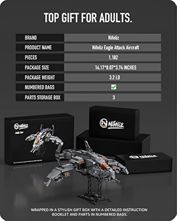 Wonderful gift - Both playable and displayable, Nifeliz Eagle Attack Aircraft is a wonderful gift that can meet your needs. For kids, this interesting military model toy opens an avenue for improving their hands-on and developing independent thinking skills, truly a great inspiring gift. Besides, with an exclusive and beautiful gift box, this Nifeliz building set saves you effort and time on packaging.
