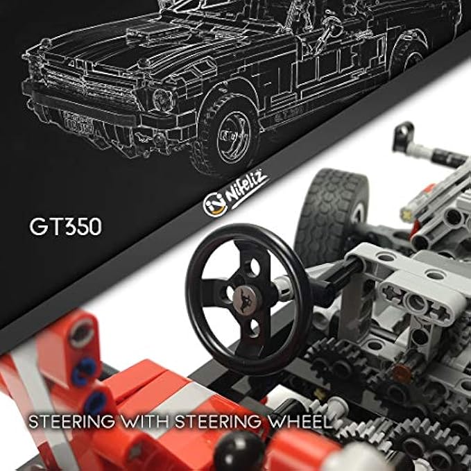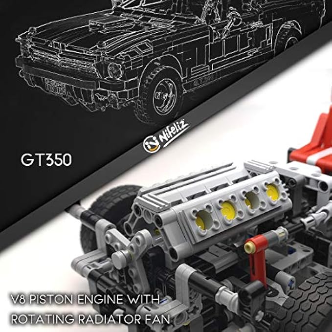 Build and customize your very own 1965s GT350, featuring dark bodywork with golden racing stripes, 4-spoke electroplated rims with rugged tires, detailed interior, V8 engine with rotating radiatior fan!