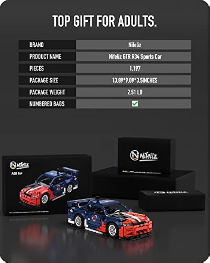 Classic Building Kit: High performance racing has captured the hearts of many passionate car enthusiasts and now you can build a Nifeliz replica of the legendary Japanese classic in the late 90s. With stylish red and blue color scheme and excellent quality, this Nifeliz GTRR Sports Car is a rare chance and must-have for car fans and lovers of all ages to build a powerful nostalgic sports car.