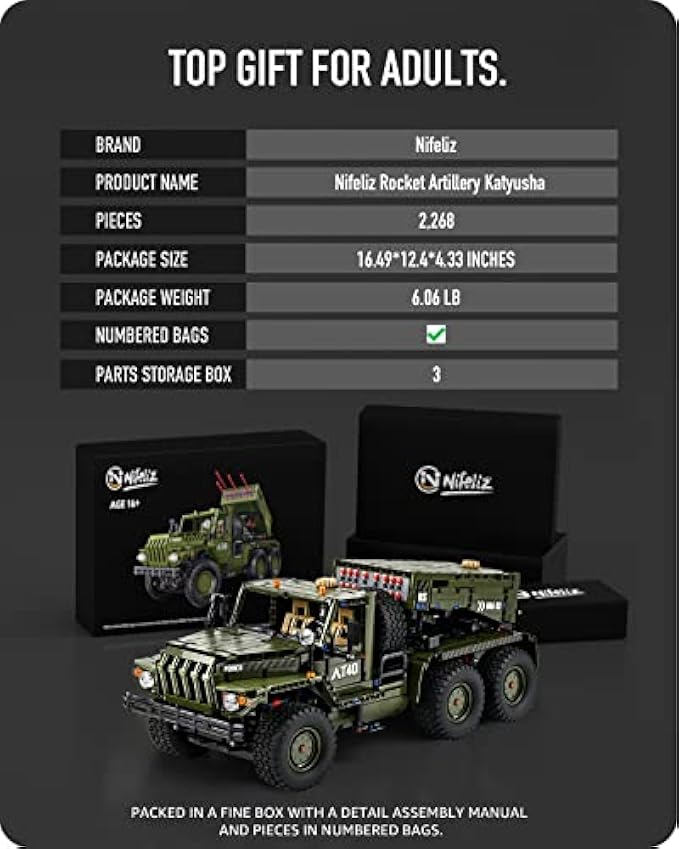 Display your chic decor - With its stunning appearance, this Rocket Artillery Katyusha model toy grabs your attention at the very first sight. This Nifeliz building set contains printed components with the typical number of a real Rocket Artillery Katyusha, showing you the exclusive charm of military trucks. You can display this awesome Katyusha tank toy at home or in the office, which is certainly chic decor and a personalized gift to express your unique taste.