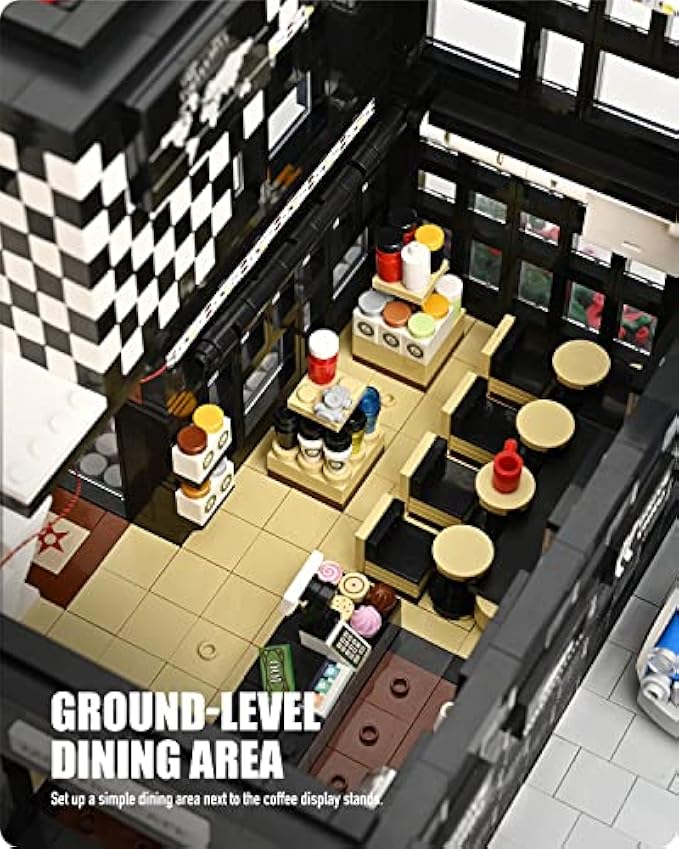 Meticulous Details - A detailed cafe model set to explore. The first floor is set up with a cashier, dining, and display area, plus a car aisle to buy coffee easier in cars. On the second floor, a bookcase is placed by the staircase, and a coffee making area is in front, next to the cozy couch area. Coupled with a blue roadster, transparent windows, lifelike ventilators on the roof, paintings, and signboards on walls... this Nifeliz model set with fine stickers restores a real coffee house.
